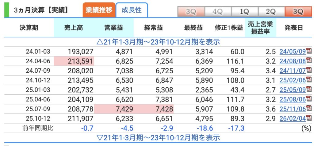 2026年2月4日、3Q決算が発表されました。