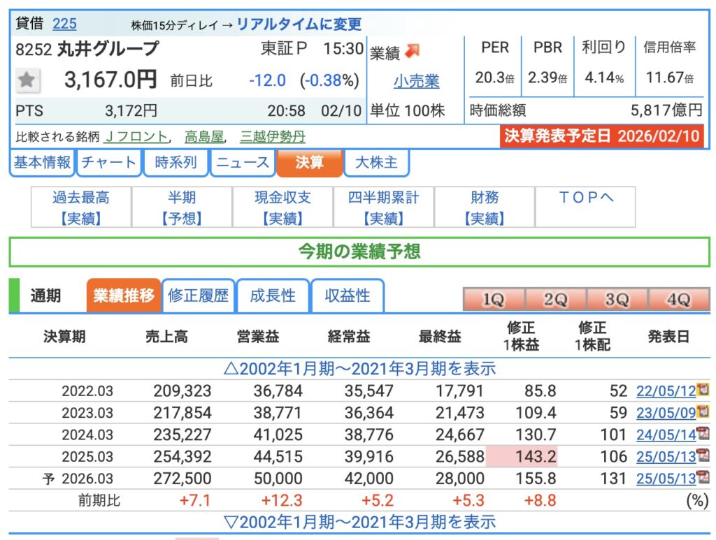 丸井グループ(8252)の決算を四半期ごとに確認します。