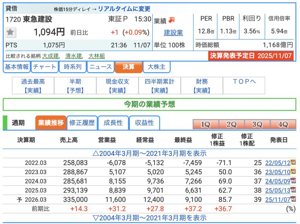 東急建設(1720)の決算を四半期ごとに確認します。