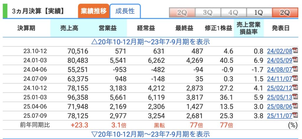 2025年11月7日、2Q決算が発表されました。