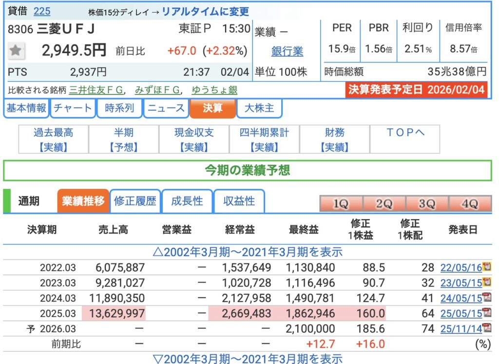 三菱UFJフィナンシャル・グループ(8306)の決算を四半期ごとに確認します。