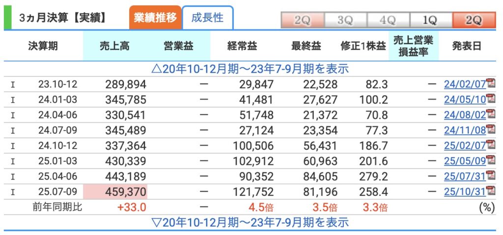 業績予想は非開示です。2Qの最終利益は126億円とちょっと寂しいです。
