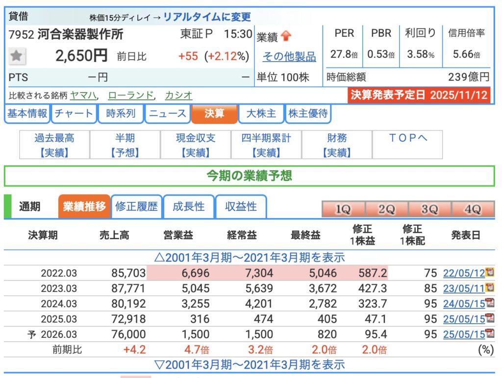主力の楽器が売れず、コスト増も利益を圧迫しているようです。下方修正が出ないか心配です。
