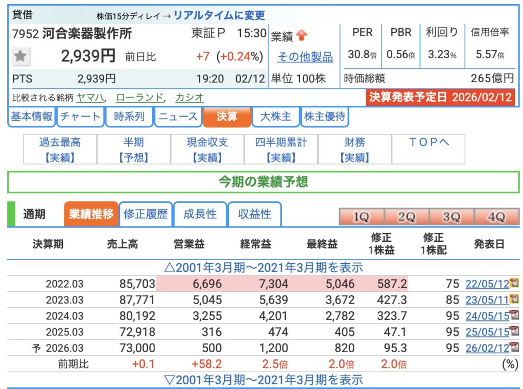 主力の楽器が売れず、コスト増も利益を圧迫しているようです。下方修正が出ないか心配です。