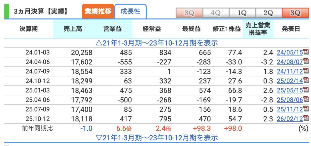 最終利益は27億円から4億円へと85%も減益の見通しです。売上も減少予想で、よろしくないパターンです。
